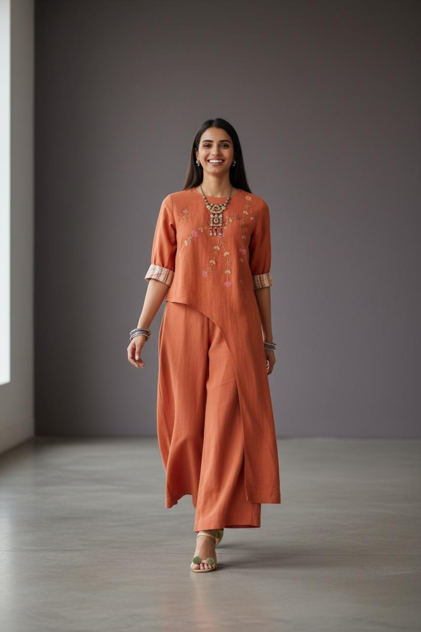 This co-ord set features a striking silhouette that immediately captures attention. The tunic, crafted from handloom cotton, boasts an earthy brown hue complemented by intricate embroidery work that adds a touch of artistry. The tunic’s most distinctive element is its unique inverted U-shaped silhouette, creating a bold yet elegant statement. Designed to be asymmetrical from the front, it offers a balanced and modern look, while the detailed contrast sleeves and contrast detailing along the border from the inside enhance its refined appeal.
