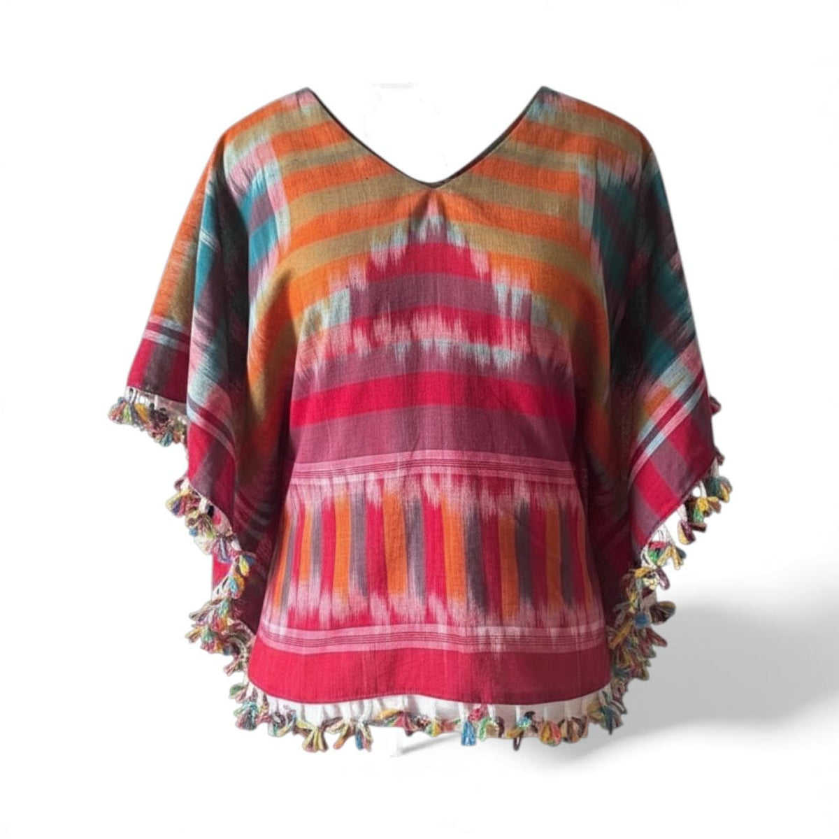 The hemline is beautifully decorated with multicolour tassel detailing, bringing a playful and vibrant touch to the overall look. Perfect for those who love to make a statement effortlessly, this kaftan is a true showstopper—sure to be the center of attention wherever you wear it. Its versatile, comfortable silhouette is ideal for both casual outings and eventful days, making it a must-have for free spirits and fashion enthusiasts alike.